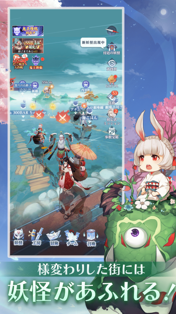 スマホのGPS(Global Positioning System)を利用して、今地図上のいているところから妖怪の位置まで実際に歩いて、地図上の敵を倒しに行くゲームであり、体感型ゲームだ。