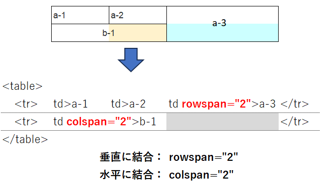 すると、結合元のセルの<td>タグに rowspan属性と colspan属性を記述し、b-2,b-3セルデータを消してみる。