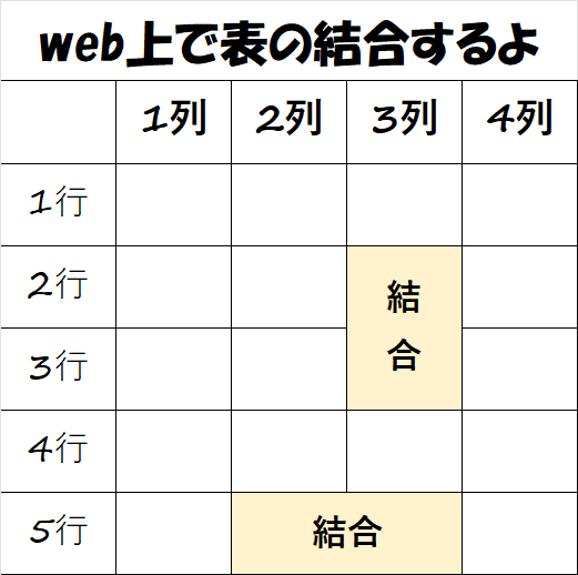 エクセルだと簡単にできる表の結合だが、webの表ではどの様に操作するのか分からない。良く使いそうな操作なので調べて出来る様にしてみたい。